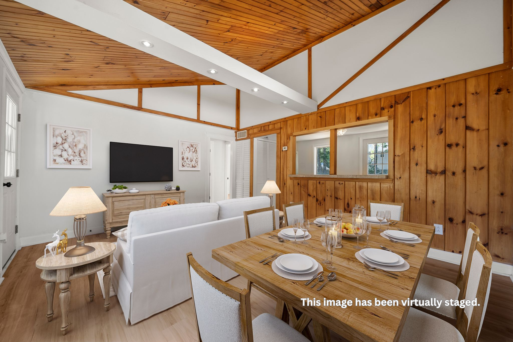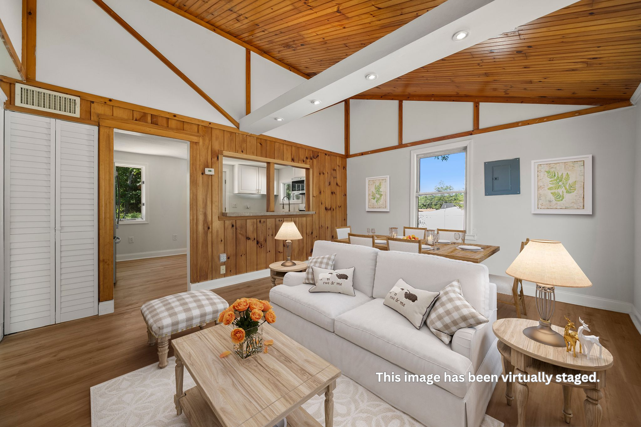 One of the standout features is the cathedral-style living room with natural wood beams stretching overhead. It creates an open, airy feeling while adding warmth and character that’s hard to find in homes of this size. The high ceiling makes the space feel larger, brighter, and more inviting—a perfect place to unwind, gather with friends, or simply enjoy a quiet evening in.