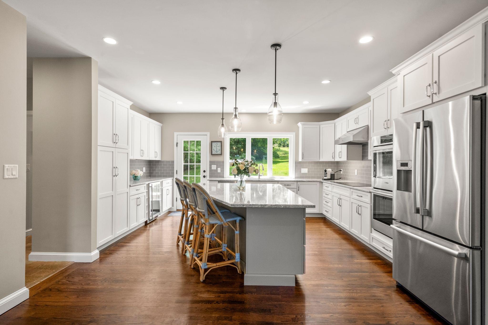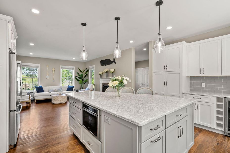 From the moment you step inside, the main level sets a tone of casual elegance and everyday functionality. The chef’s kitchen is the heart of the home—outfitted with quartz countertops, stainless steel appliances (range, wall oven, microwave, and fridge included), and a layout that flows beautifully into the dining and living spaces.