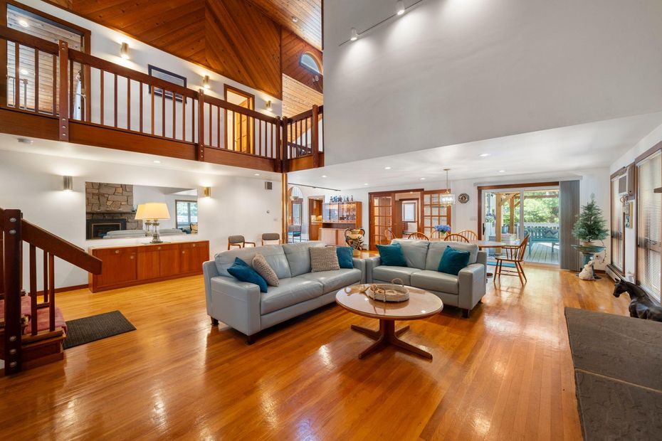 The heart of the home is a huge 48ft great room with soaring cathedral ceilings, perfect for entertaining or simply relaxing in a spacious environment. Cozy up on chilly nights with a crackling fire in the massive Delaware Valley Sandstone fireplace, adding a touch of rustic elegance.